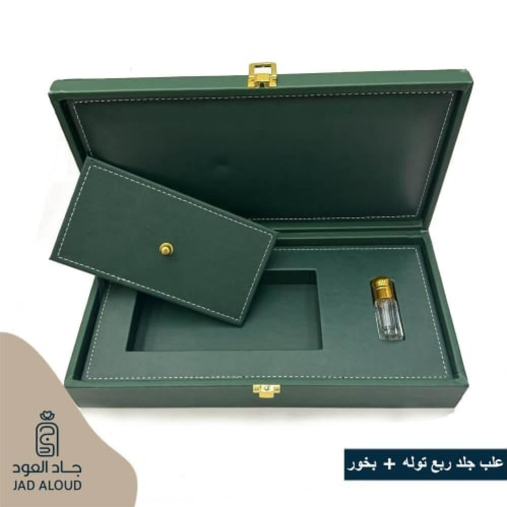 🟡علبة فاخرة من الجلد الإيطالي تحتوي على زجاجة ربع توله فارغة ومكان مخصص للبخور.