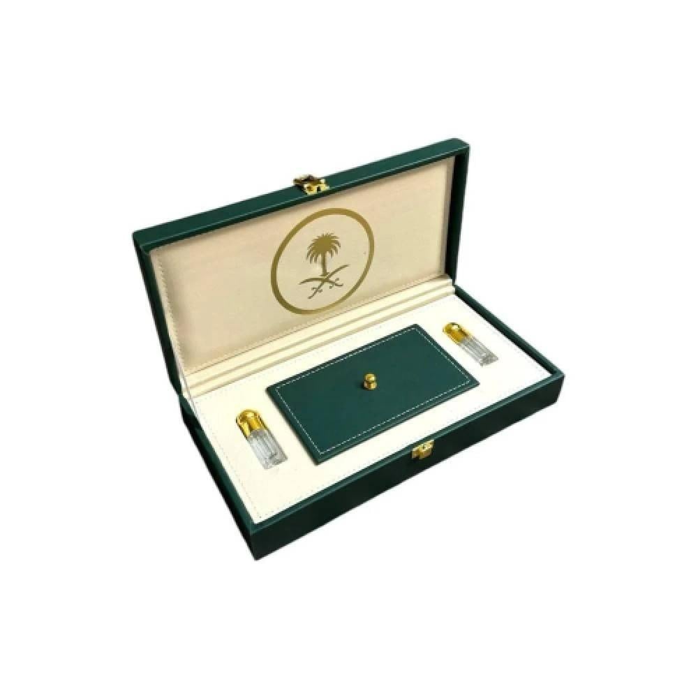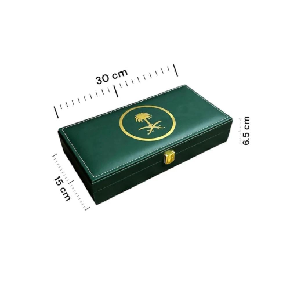 بوكس الإهداء من جاد العود مصنوع من جلد إيطالي فاخر باللون الأخضر الملكي، مزين بشعار السيفين والنخلة مطبوع من الداخل والخارج ليعكس الهوية السعودية بأسلوب راقٍ.